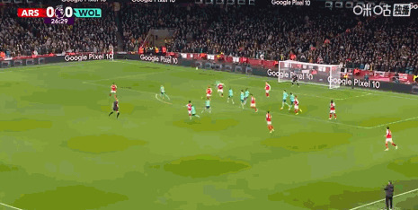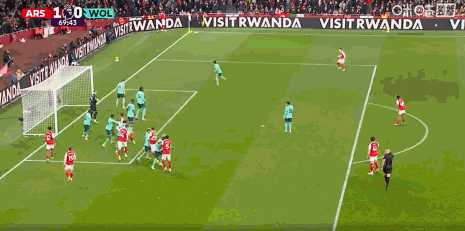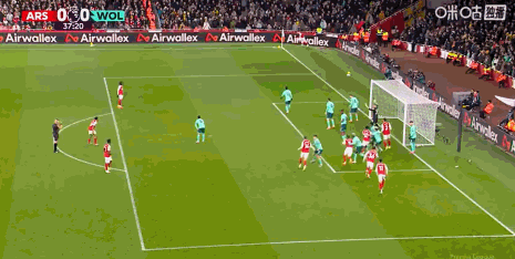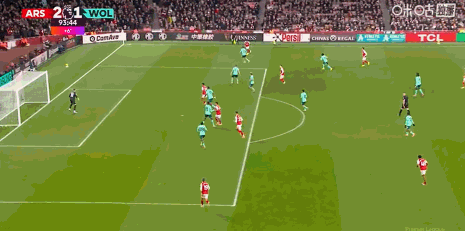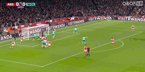 第67分钟,赖斯任意球直接攻门,狼队门将指尖托出